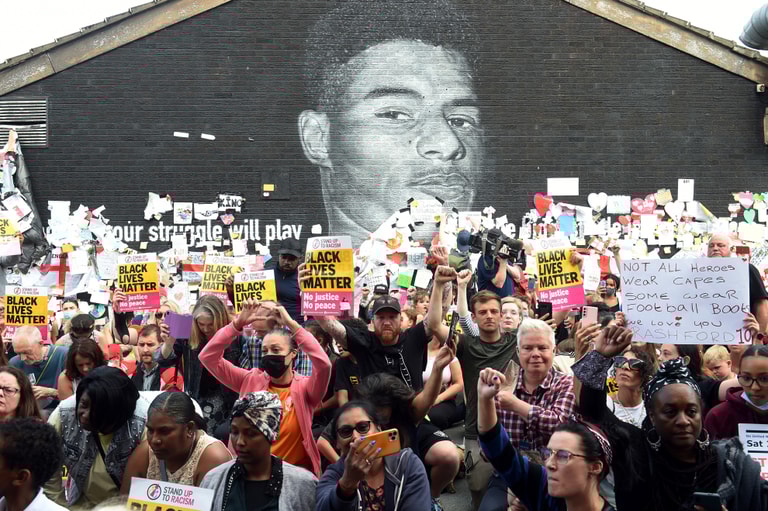 在位於曼徹斯特南部的郊區威辛頓(Withington),人們站在被破壞的英格蘭隊足球員拉什福德(Marcus Rashford)的壁畫前,抗議種族歧視。