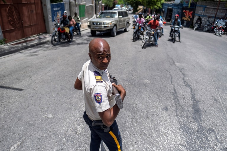 在首都太子港,一名海地國家警察在有「海地比佛利山莊」之稱的佩蒂翁維爾(Petion-Ville)社區巡邏,這裡住了許多外交使節、外國商人以及當地富人,在海地總統摩依士(Jovenel Moise)在上周遭暗殺後,當局派出大批警方巡邏敏感區域。