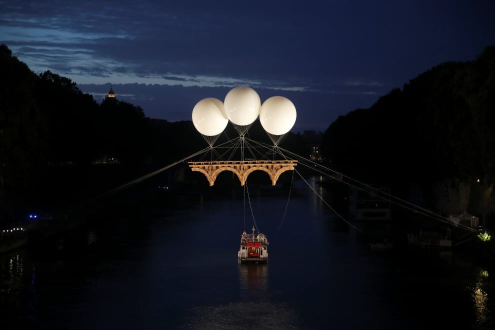 在羅馬的台伯河(Tiber river)上,可以看到法國裝置藝術家格羅斯泰特(Olivier Grossetete)的作品——一座由三顆氦氣球吊起的浮橋,且這座浮橋的靈感得自米開朗基羅(Michelangelo)。