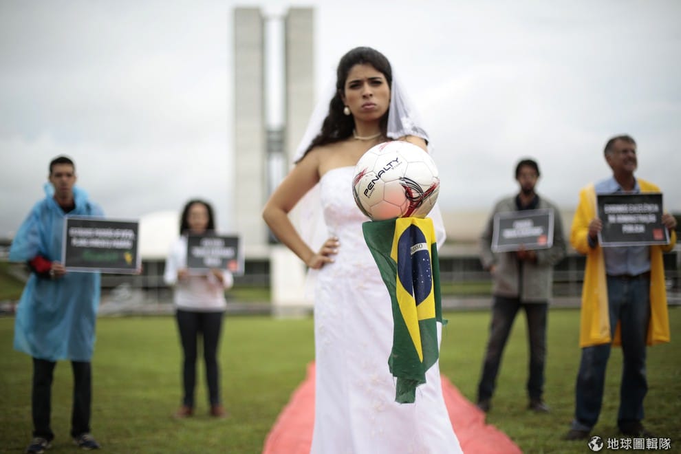 非政府組織「和平里約」(Rio de Paz)的成員站在國會大樓前,讓一名裝扮成新娘的女性手拿足球,比喻當地迎接2014世界盃足球賽的相關建設趕不上時程,落後進度的程度就跟遲到的新娘子一樣