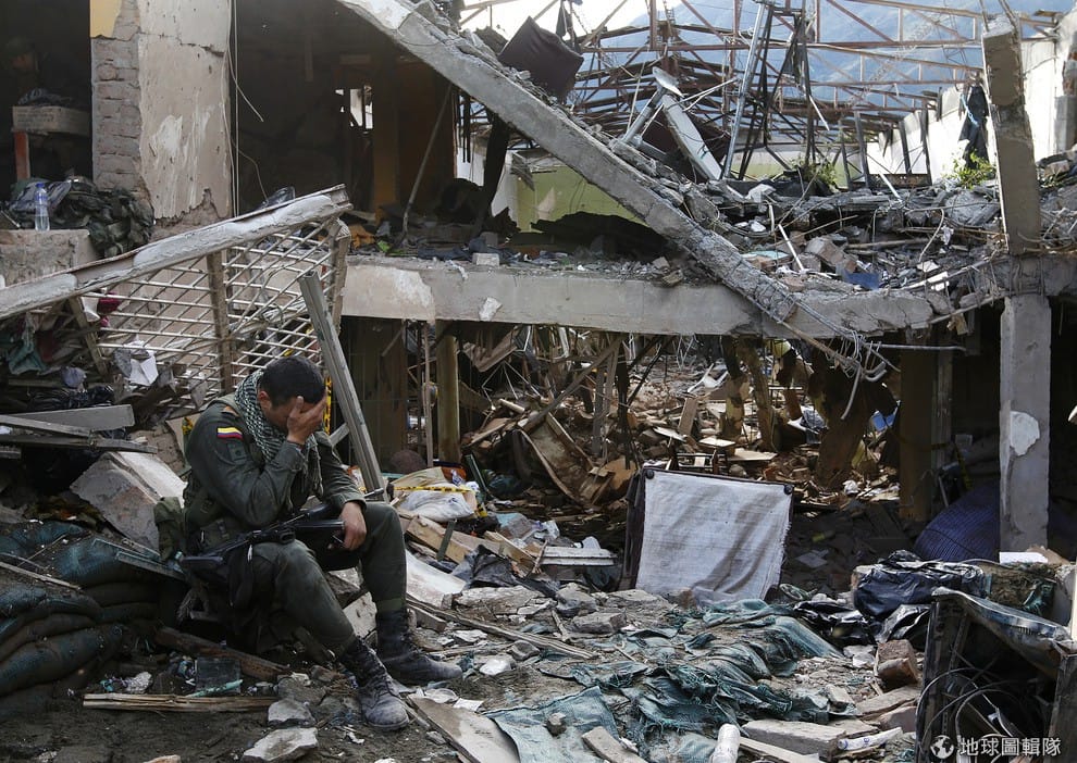 警察坐在被炸彈炸毀的建築和車輛殘骸中,7號時當地南方的村落發生炸彈攻擊,釀成至少8人死亡,20多人受傷,哥國軍方認為這場攻擊是出自左派的游擊軍所為