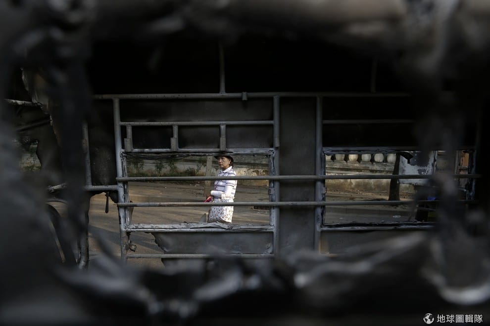從一輛燒毀的汽車窗戶望出去,可以見到一名女性站在遠方。泰國反政府的示威者們在7號時對政府下通牒,並表示9號是一個讓大家再度對政府施壓的黃道吉日
