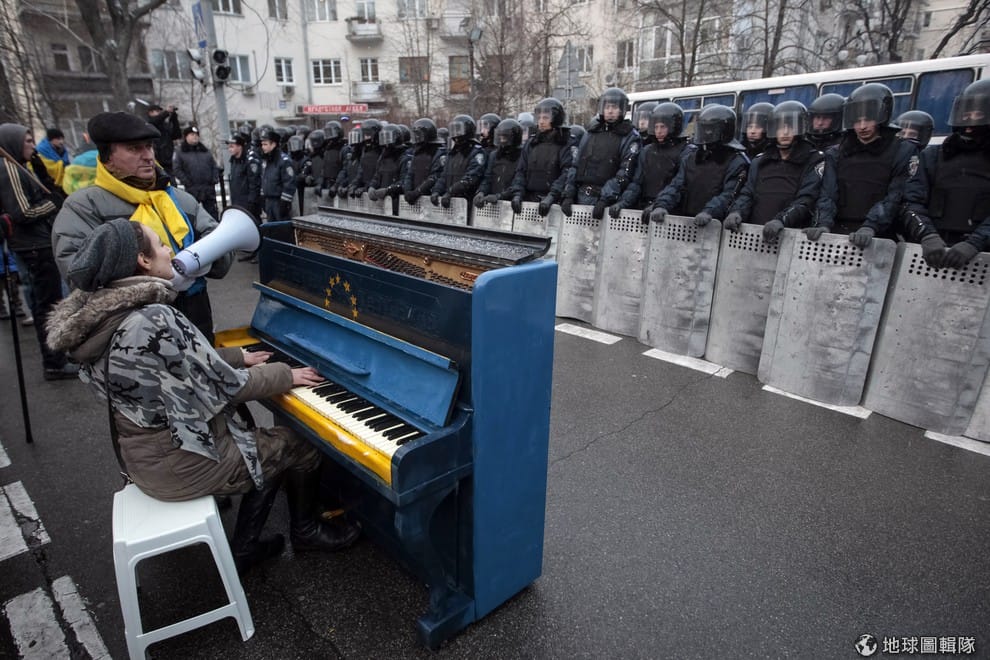 示威者們對著站在總統府前的警方邊彈鋼琴邊唱歌,這架鋼琴還特意放上了烏克蘭和歐盟的標誌強調雙方的合作。自從烏克蘭總統改變決定不與歐盟貿易合作後,當地就出現許多示威抗議活動