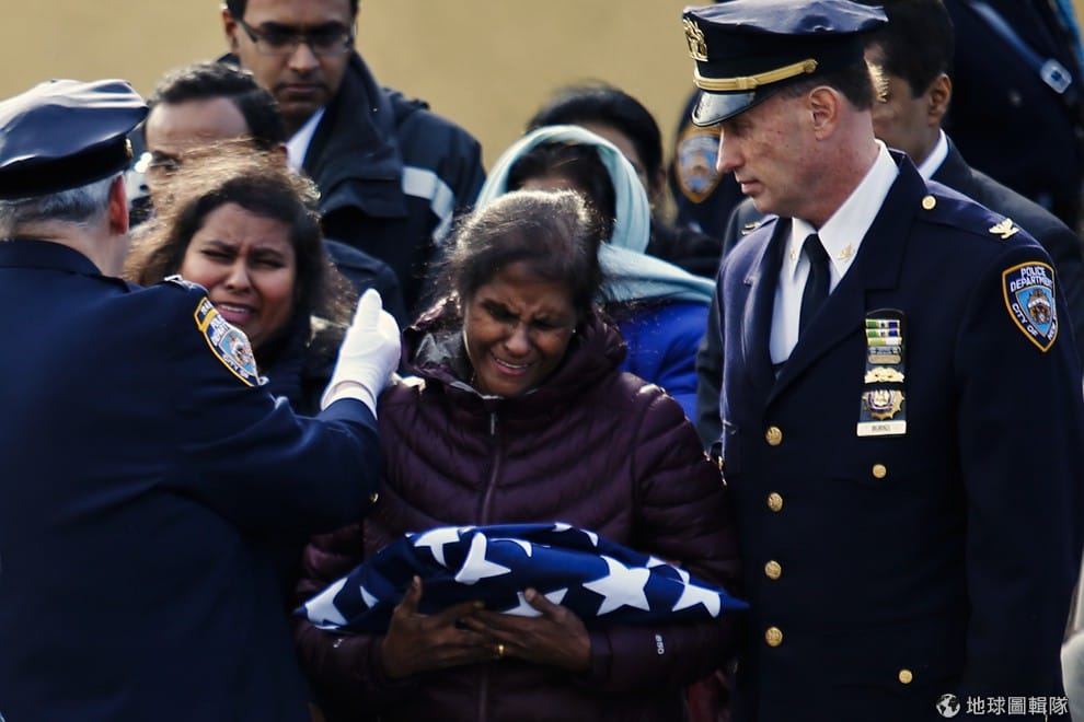 照片中接過美國國旗的達米加太太(Dammika)哭得非常傷心,她的丈夫萊納新荷(Kalyanarat Ranasinghe)在值勤時遭到卡車撞擊拖行身亡