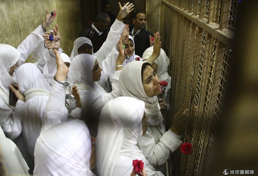 照片中的女性正在和為她們請願的民眾揮手,她們因為支持伊斯蘭教的示威活動阻礙交通,遭到逮捕判刑,有14名女性被判處有期徒刑11年,她們之中還有的是18歲以下的未成年少女