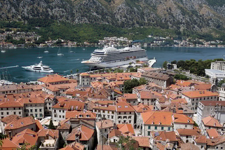 在風光明媚的港口城市科托爾(Kotor),可以看到挪威巨型郵輪「維京維納斯」(Viking Venus)載著旅客入港,這也是繼疫情蔓延以來,首艘入港並且放乘客下船活動的郵輪。