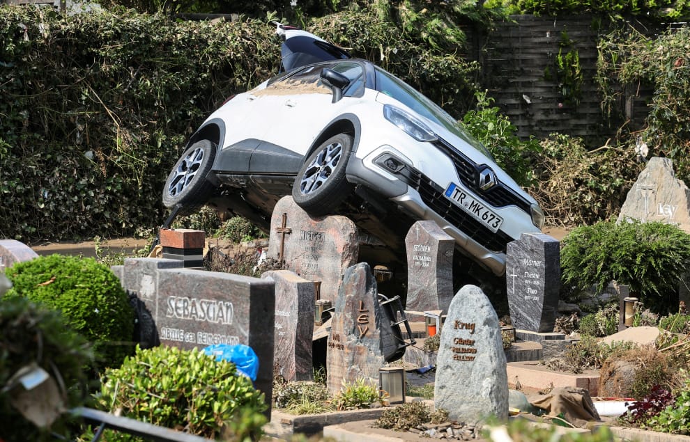 在遭到大水侵襲的萊茵蘭-普法茲邦(Rhineland-Palatinate)德爾瑙市(Dernau),可以看到一輛車被大水沖進墓園中,水退後卡在了墓碑上動彈不得。