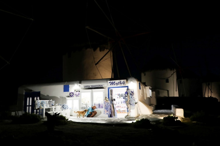 在向來遊人如織的觀光島嶼米科諾斯島(Mykonos Island),一名老闆準備關店,響應政府對餐廳、酒吧等營業場所的防疫宵禁令。