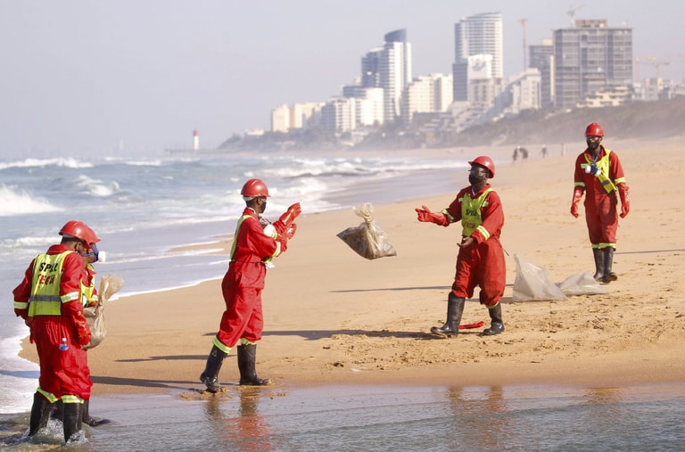 在夸祖魯-納塔爾省第一大城德爾班(Durban),廢棄物清潔團隊在緊鄰印度洋的海岸清出一袋袋的死魚,牠們因為倉庫外洩的化學物質進入水體而中毒身亡。而當事倉庫之所以會讓化學物質外洩,是因為連日來不肖人士仗著前總統祖瑪(Jacob Zuma)被關、社會陷入混亂之際,放火破壞和洗劫各大商家,其中就包含這座當事倉庫。