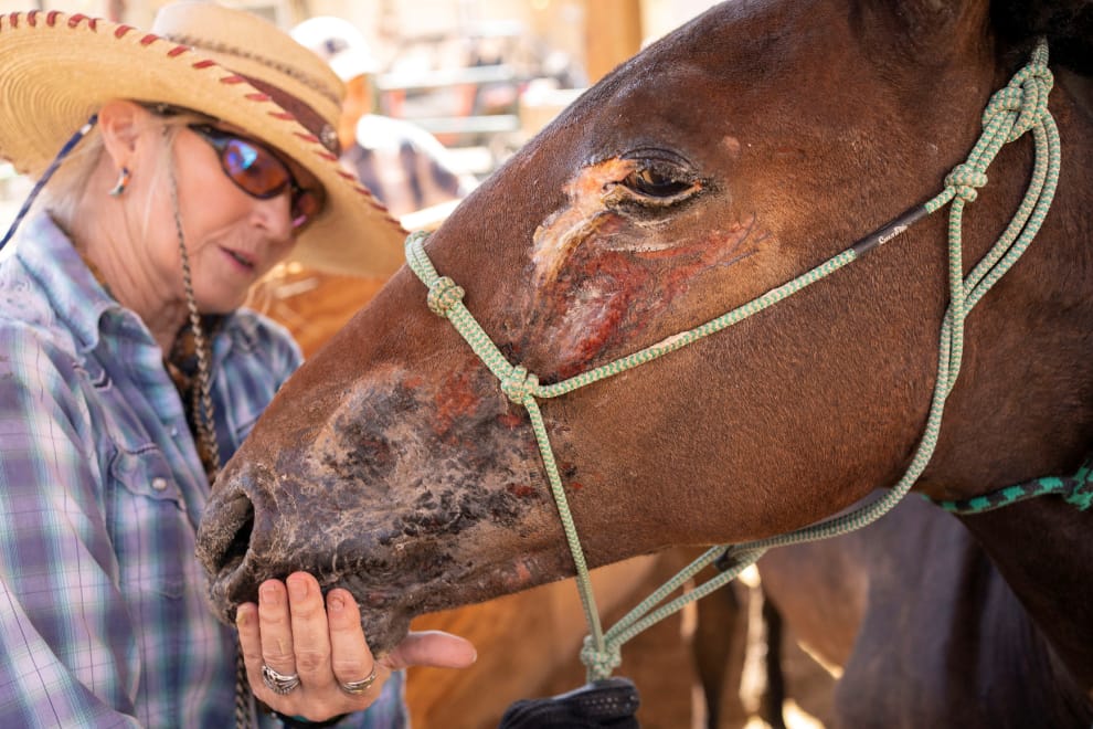 在華盛頓州岩島市(Rock Island)的一座牧場,動物志工朵爾(Zo Dore)正在照顧一隻遭到火劫的駿馬,牠被當地的森林大火Chuweah Creek Fire給攻擊,在被動物福利組織Okandogs救下後,暫時安置在牧場中休養。