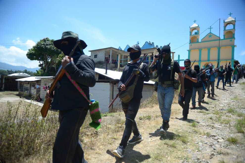 在墨西哥東南部恰帕斯州(Chiapas)的潘泰略小鎮(Pantelho),原民守望相助隊「彎刀」(El Machete)的成員正在遊行,他們專門為了抵禦無惡不作的販毒集團而存在。