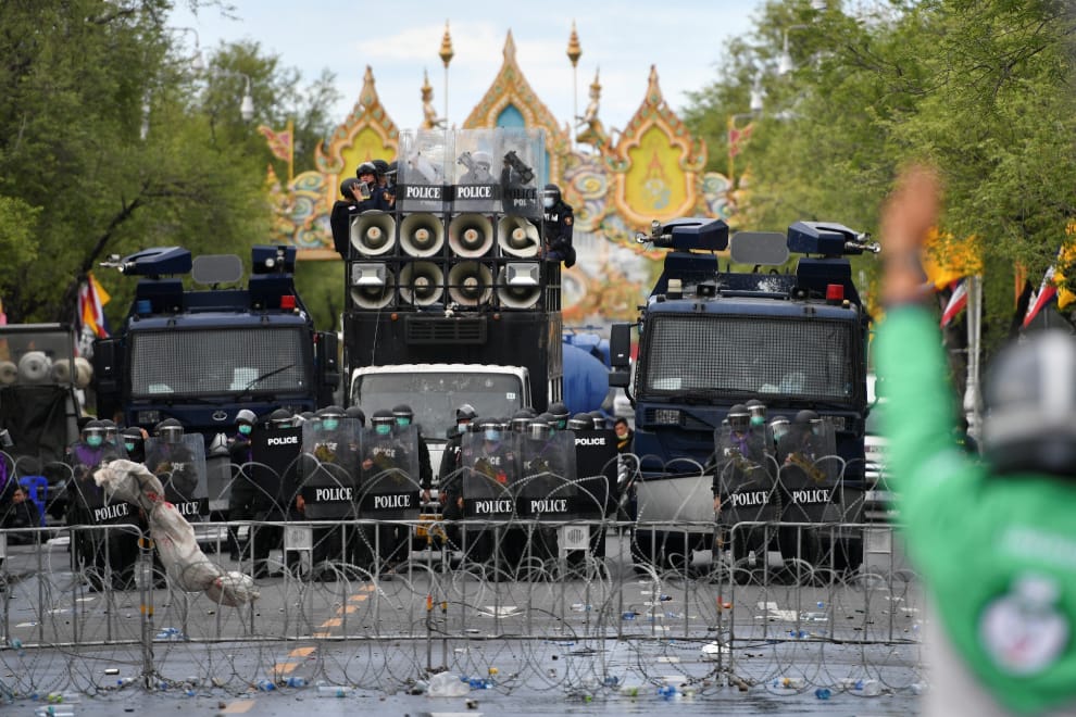 在首都曼谷,可以看到當局派出鎮暴警察準備鎮壓反政府示威者,反政府民眾準備一路遊行到泰國總理帕若育(Prayuth Chan-ocha)的辦公室,要求他為防疫不力和救不了經濟下台。為此,警方也祭出橡膠子彈、水炮和催淚瓦斯來驅散反政府民眾。