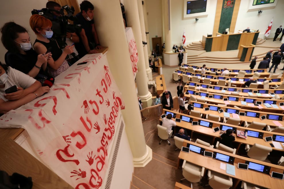 在喬治亞國會開議期間,大批記者從議場二樓放下寫著「懲罰殺人犯」字樣的布條抗議,要求國會議員能從Pirveli TV攝影記者拉什卡拉瓦(Alexander Lashkarava)的死學到極右派分子正在破壞喬治亞社會的和平。