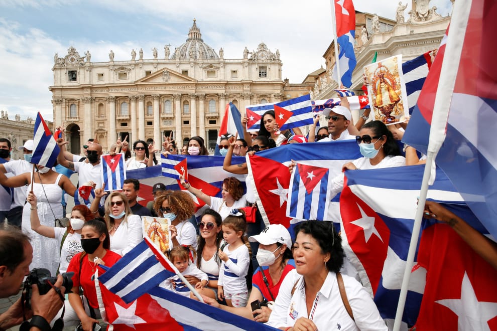 在聖彼得廣場,羅馬天主教宗方濟各(Pope Francis)準備帶領禱告之際,當地古巴社群揮舞著古巴國旗,希望外界可以注意到古巴民眾目前面臨的困境。