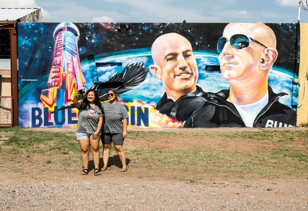 在德州范霍恩小鎮(Van Horn),一對姊妹在太空公司藍色起源(Blue Origin)創辦人貝佐斯(Jeff Bezos)和他的兄弟馬克(Mark Bezos)的壁畫前拍照。