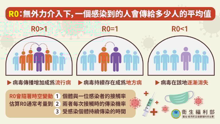 因此,當R0的數字越大,代表該傳染病越難控制。若R0< 1,傳染病將會逐漸消失;若R0= 1,傳染病會持續存在該特定區域,成為地方性流行病(Endemic);若是R0> 1,則該傳染病會以指數方式散佈,成為所謂的流行病(Epidemic)。