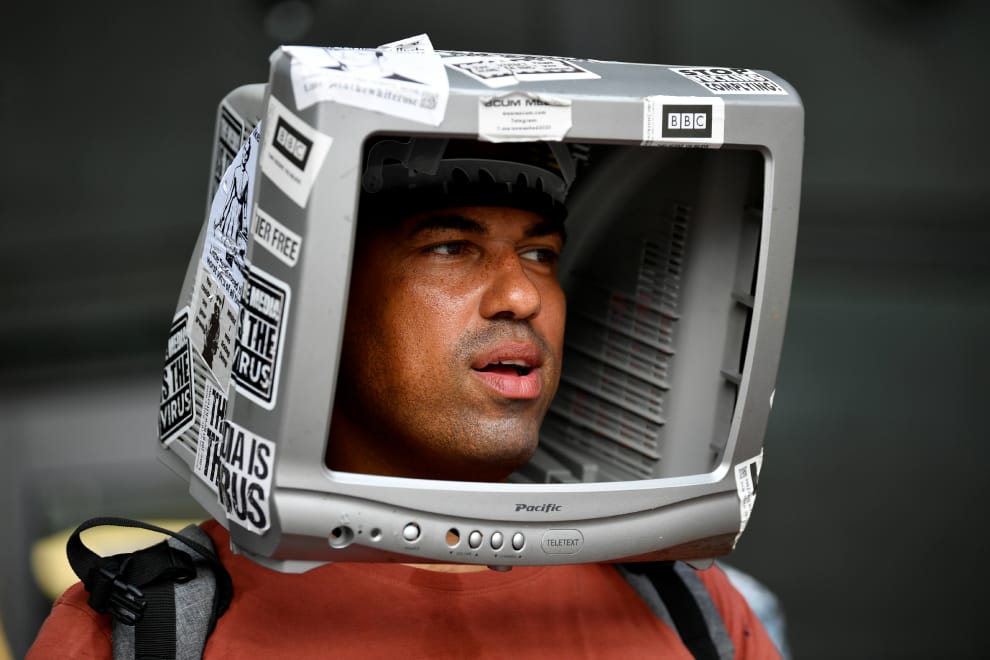 首圖故事:一名頭戴電視框的人正在參加「解放日」活動......