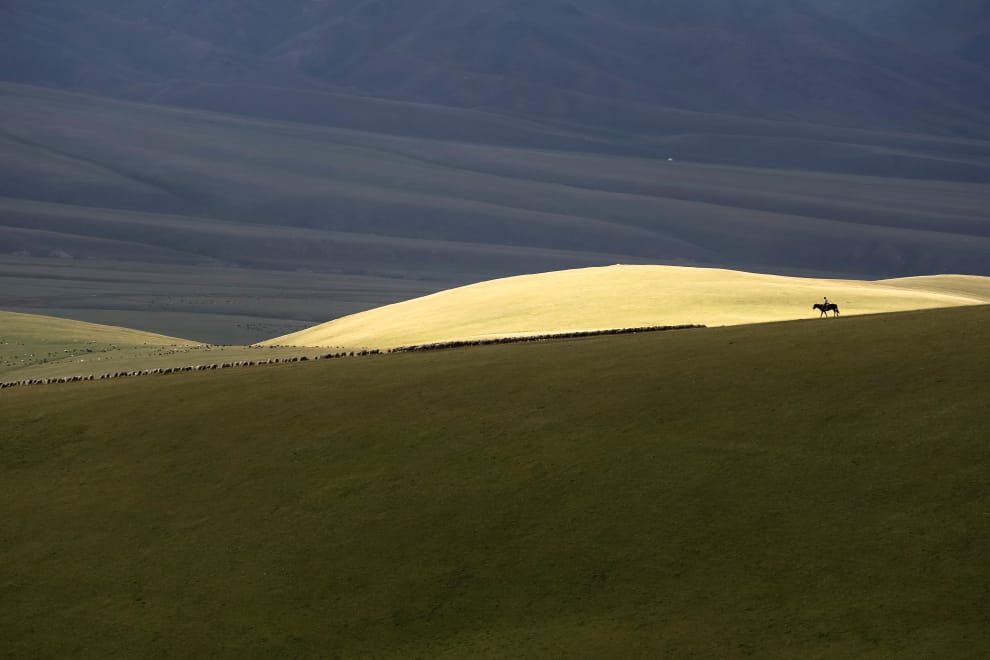 在哈薩克第一大城阿拉木圖(Almaty)東方的阿薩高原(Assy plateau),一名牧羊人騎著馬在趕羊。