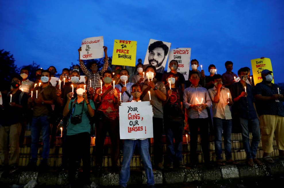 在達卡大學內,孟加拉攝影記者們點起蠟燭、手拿海報和印度《路透社》攝影記者西迪基(Danish Siddiqui)的肖像,悼念他的離世。其中,一名攝影記者手上的海報寫著「你的槍,就是我們的鏡頭」。