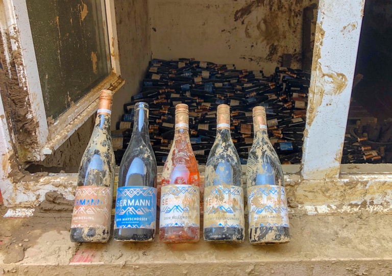 在遭到大雨重創的萊茵蘭-普法茲邦的阿爾特納爾(Altenahr),一間釀酒廠的員工將一瓶瓶酒從淤泥中挖出來。