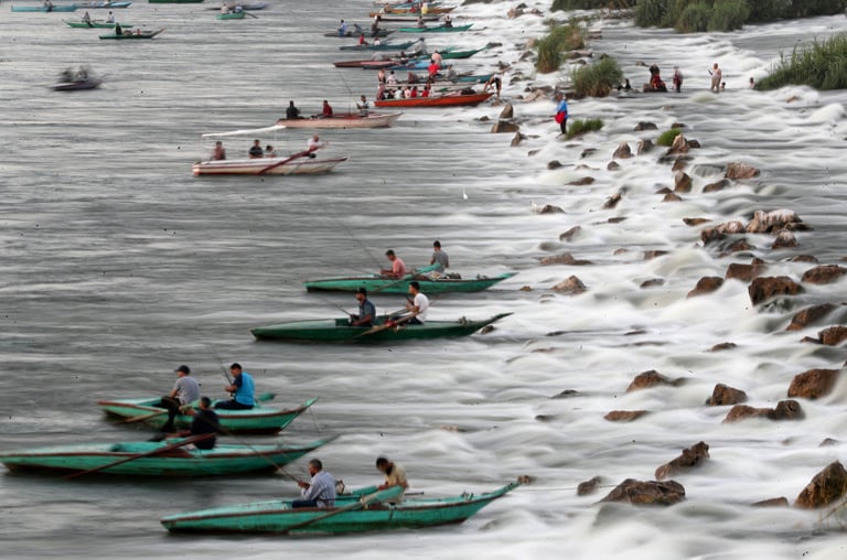 在開羅外圍的尼羅河上,漁人們駕船前來捕魚。