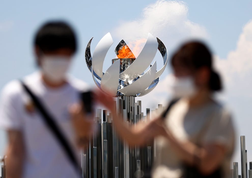 在日本首都東京的夢之大橋旁,兩位民眾在東京奧運的火炬台前準備拍照。