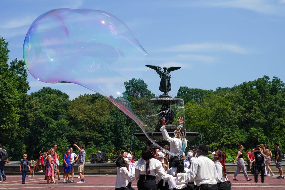 在美國紐約市中央公園(Central Park)的畢士大噴泉(Bethesda Fountain)旁,表演藝術者們合力製造出了一顆巨大的泡泡。