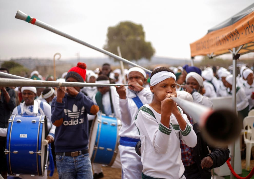 在南非東部的德爾班市(Durban),樂師們在庫瑪洛(Delani Khumalo)和姆隆迪(Mlondi Khumalo)這對表兄弟的葬禮上表演,他們都在近期南非的動亂中遭人殺害。