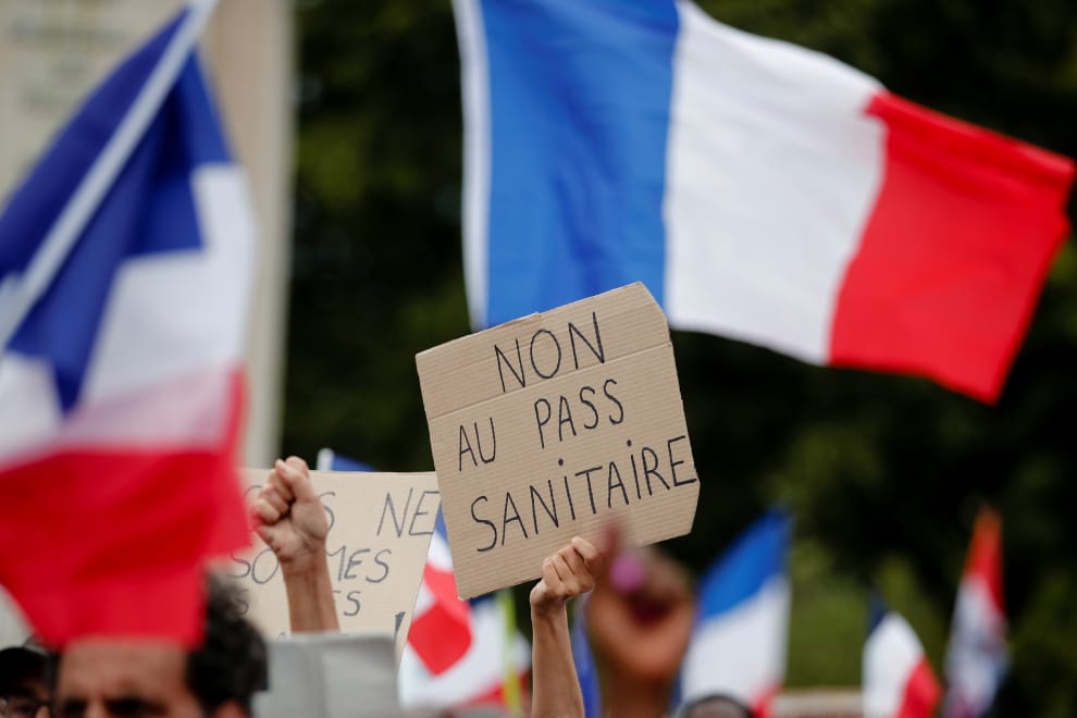 在法國首都巴黎的特羅卡德羅廣場(Trocadero Square)上,法國右翼政黨愛國者(Les Patriotes)舉辦了一場反對政府防疫政策的示威活動,其中一人在活動中高舉起寫著「不要健康護照」的標語。