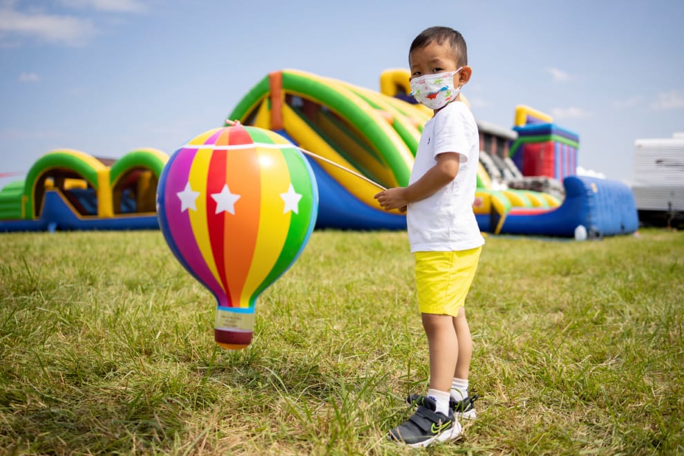 在美國紐澤西州雷丁頓鎮(Readington)的紐澤西州熱氣球節(New Jersey Lottery Festival of Ballooning)上,一名小男孩與一顆玩具熱氣球合影。