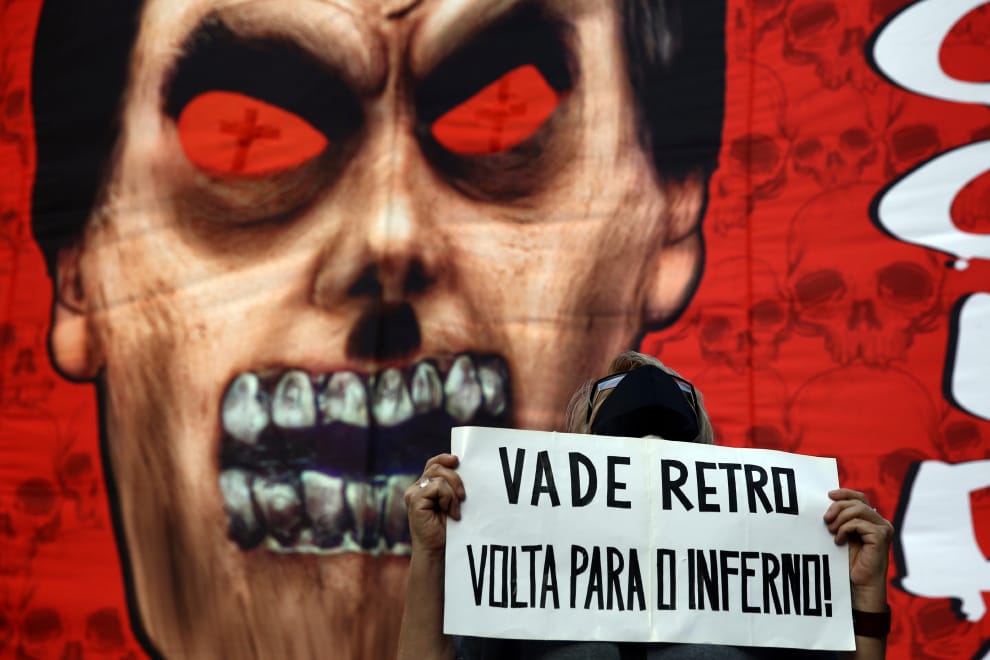 在巴西大城聖保羅,一名男子在一場抗議巴西總統波梭奈羅(Jair Bolsonaro)的示威中,舉起一塊寫著「回地獄去」(Go back to hell)的標語。
