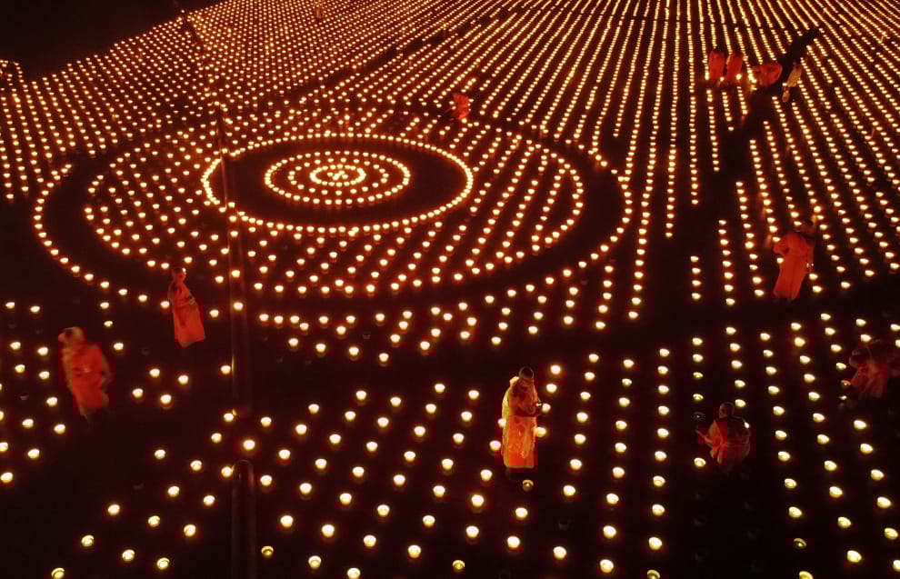 在泰國巴吞他尼府 (Pathum Thani)的法身寺(Dhammakaya Temple)裡,泰國僧侶在三寶佛節(Asalha Puja Day)期間擺出一盞又一盞的蠟燭,一方面慶祝節日,另一方面也展現出對泰國民眾的支持。