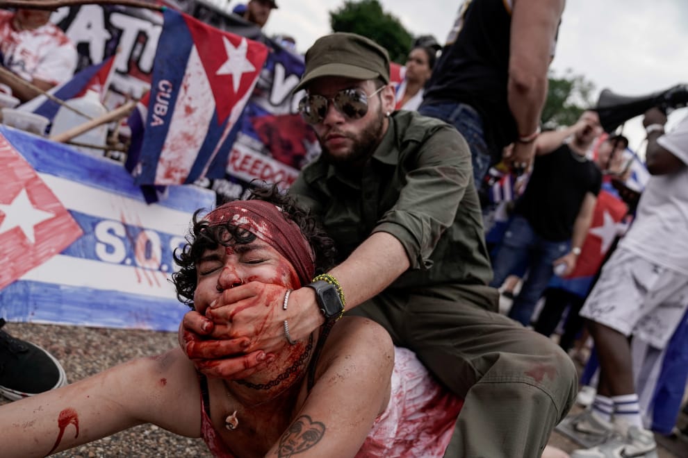 在華盛頓特區,示威者們在白宮前表演出古巴民眾遭古巴政府壓迫下的困境。