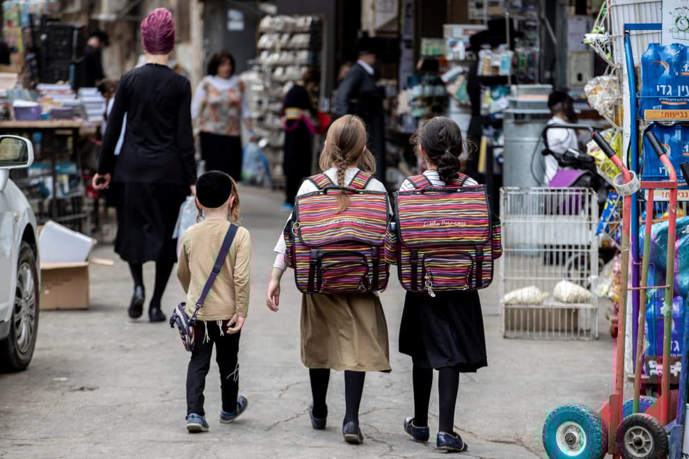 在以色列耶路撒冷的街頭,兩名信奉猶太正教的女孩揹著書包走在路上。