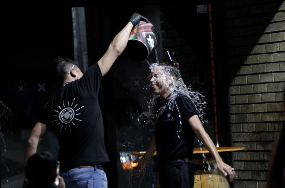 在墨西哥東北部的蒙特雷市(Monterrey),一名夜店員工將整桶水倒在同事身上。