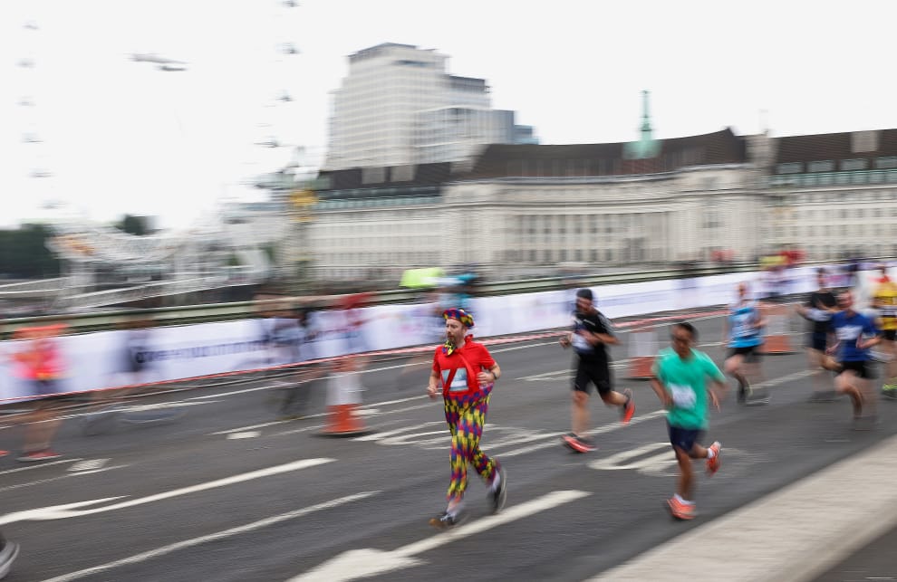在英國首都倫敦的ASICS 10公里慢跑活動上,選手們大步跑過西敏橋(Westminster Bridge)。