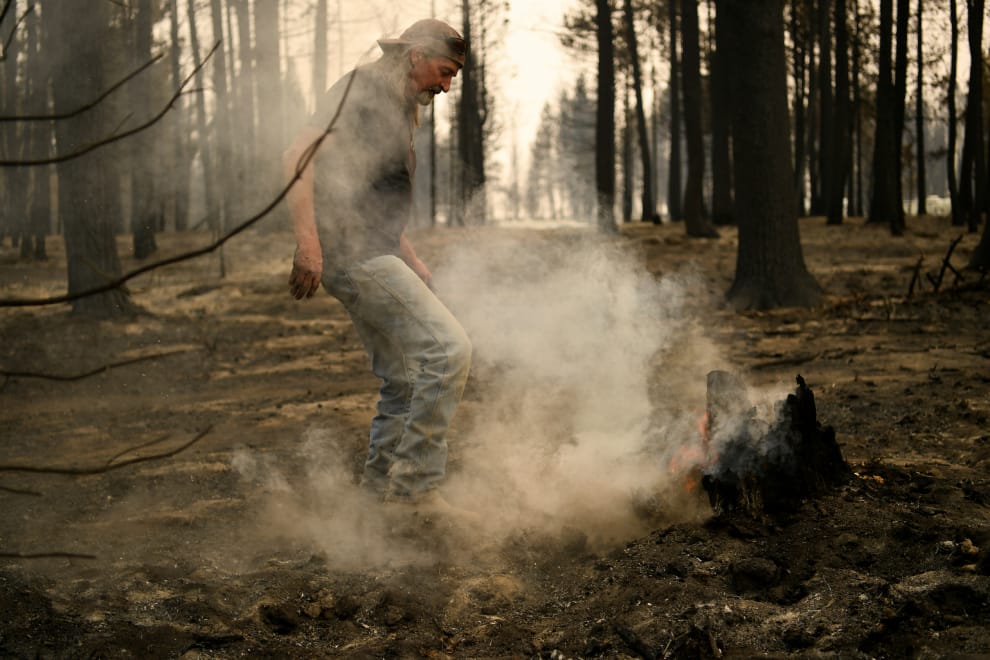 在美國奧勒岡州賽坎莊園(Sycan Estates)附近,曾住在這個地區的居民格里芬(Scott Griffin)在野火熄滅後回來察看家園。過程中,他抬腳試圖熄滅還在一截樹幹中悶燒的火苗。