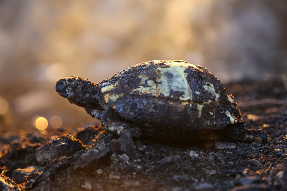在土耳其西南部的馬納夫加特鎮(Manavgat),一場野火過後,一隻烏龜焦黑的遺骸出現在野火肆虐過的土地上。
