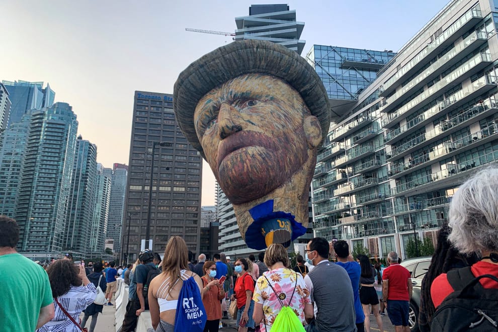 在加拿大的多倫多市(Toronto),《梵谷沉浸體驗展》(Immersive Van Gogh Exhibit,暫譯)的策展團隊在城市的一隅施放一個高達 28公尺的巨大梵谷(Vincent Van Gogh)頭像氣球。