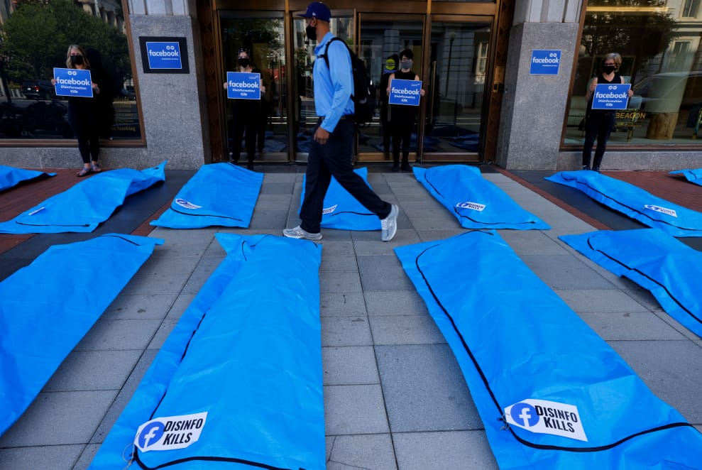 在華盛頓特區,示威者們在Facebook總部外排開屍袋,抗議Facebook上充斥著無數關於COVID-19疫情的假消息。