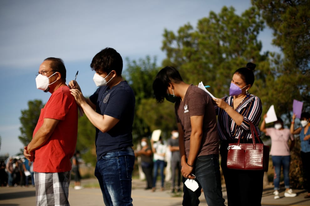 在位於美墨邊界的華瑞茲城(Ciudad Juarez),兩位墨西哥民眾借了另兩人的背權充書桌以填寫資料。這是美墨兩國新達成的一項疫苗合作計畫,稍後這些民眾就會經由橫跨兩國邊境的瓜達魯佩(Tornillo-Guadalupe)橋,前往美國接種COVID-19疫苗。