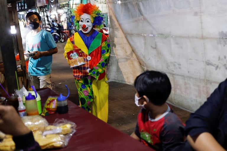在印尼首都雅加達的佩瓊蓬安區(Pejompongan),現年 30歲、打扮成小丑模樣的亞歷克斯(Alex)帶著鐵罐,進入路邊的一座小吃攤中。亞歷克斯是一名街頭藝人,平時他以沿街跳舞維生。