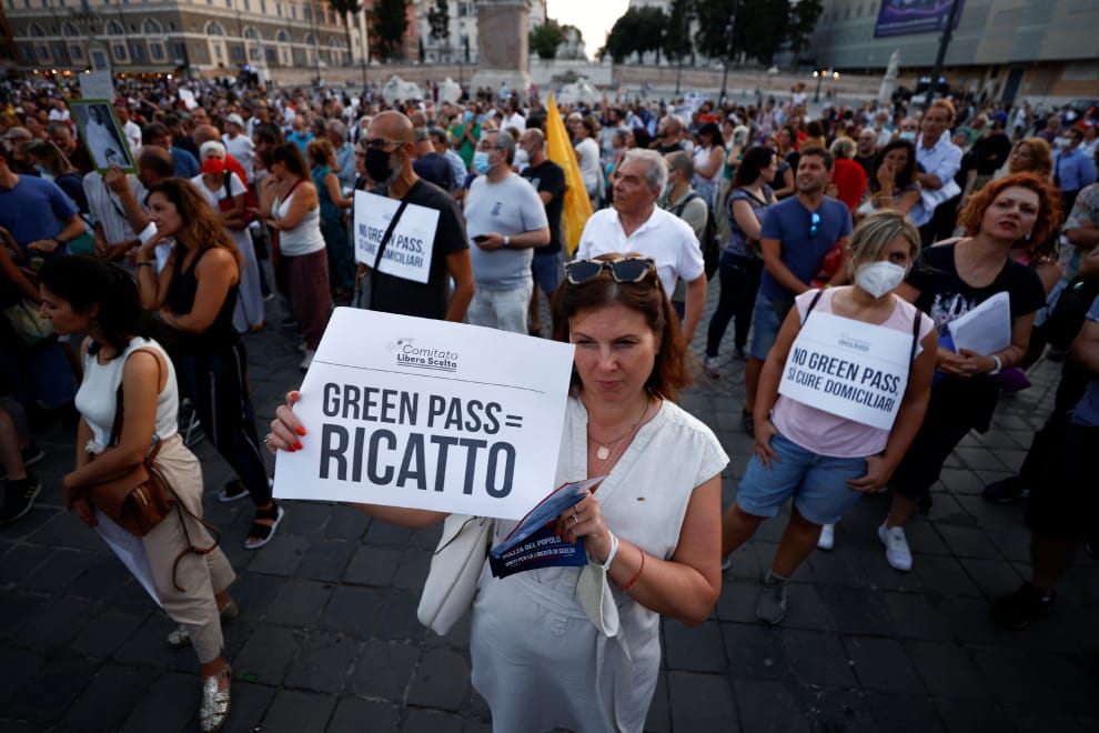 在義大利首都羅馬,民眾紛紛上街抗議義大利即將上路的「綠色通行證」(Green Pass)政策。前方民眾手持的標語寫著:「綠色通行證=勒索」。