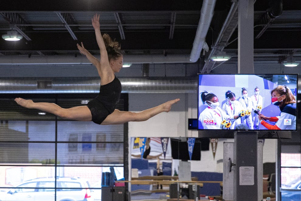 在美國紐約市布魯克林區的哥譚體育館(Gotham Gymnasium)內,現年 18歲的戴維斯(Maya Davis)正在接受體操訓練,身後的電視則在播映本屆東京奧運賽事的畫面。