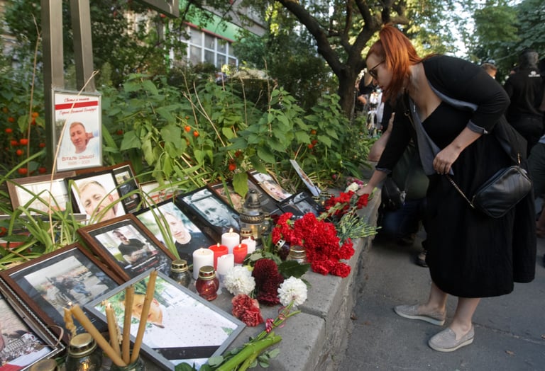 在位於基輔的白羅斯駐烏克蘭大使館前,白羅斯人紛紛來此悼念席修夫。