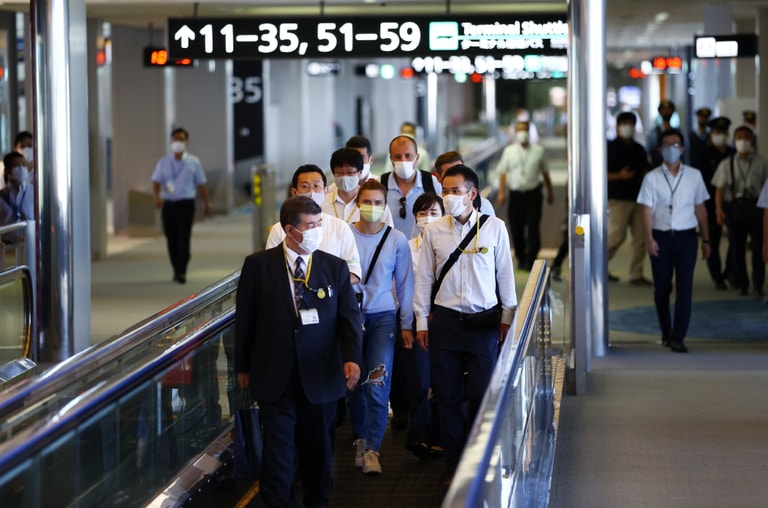 圖為白羅斯短跑女將齊馬努斯卡婭(藍衣者),她在 4號這天於眾人的陪伴下來到日本成田國際機場,準備飛往奧地利維也納。而她飛抵維也納後是否會轉往波蘭華沙,仍是未知數。