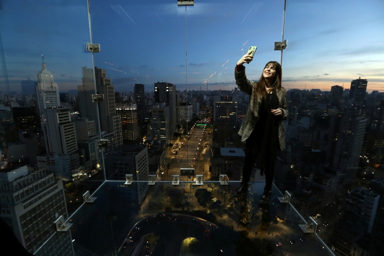 在巴西的聖保羅市,一名網紅在當地的知名景點「桑帕天空」(Sampa Sky)中自拍。「桑帕天空」是一個上、下、左、右全由強化玻璃構成的空間,站在其中,人們將能遍覽聖保羅市的風光。