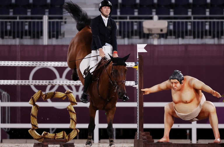 事實上,在本次東京奧運的馬術比賽中,有很多設置在賽場上的障礙物都加上了濃濃的日本特色,像是藝妓、縮小版日本宮殿和太鼓等,只是它們都不如相撲雕塑一樣引人注目。