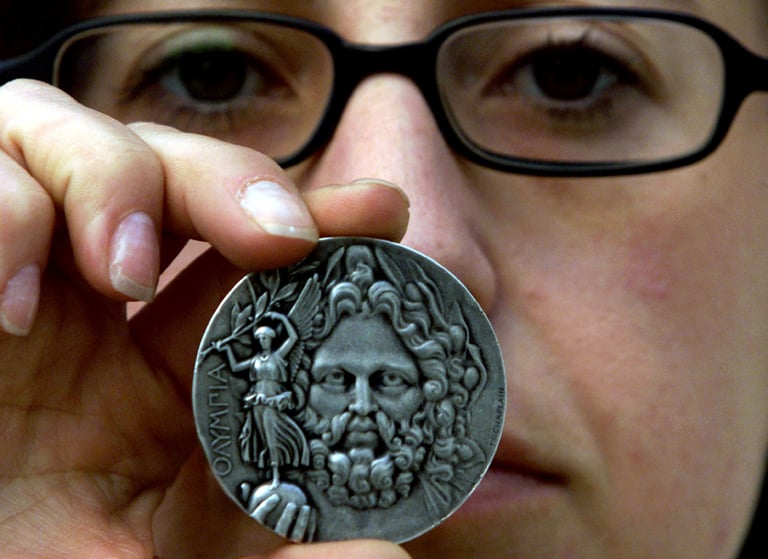 舉例來說,今年美國的RR拍賣行(RR Auction)剛以 1,283美元(折台幣約 3萬6,026元)的價格,拍出一塊 1900年巴黎奧運射擊比賽的銀牌;另一塊在 1896年雅典奧運頒發的「第一名銀牌」(註),則是以 18萬111美元(折台幣約 505萬7,517元)拍出。