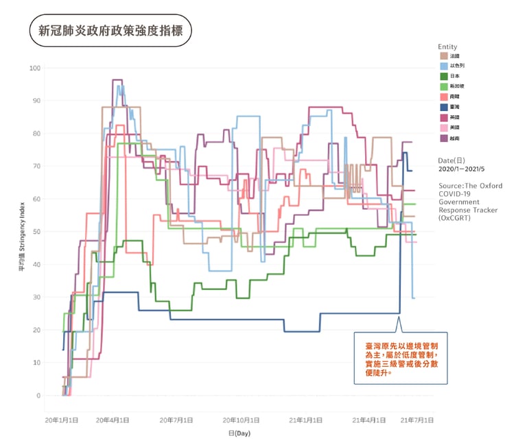 以臺灣來說,過去一年以邊境管制為主,沒有大規模停班停課,維持在 20 至 30 分。進入三級警戒後,折線陡升至 70 分以上,大約居於全球 34 名,衝入前五分之一。